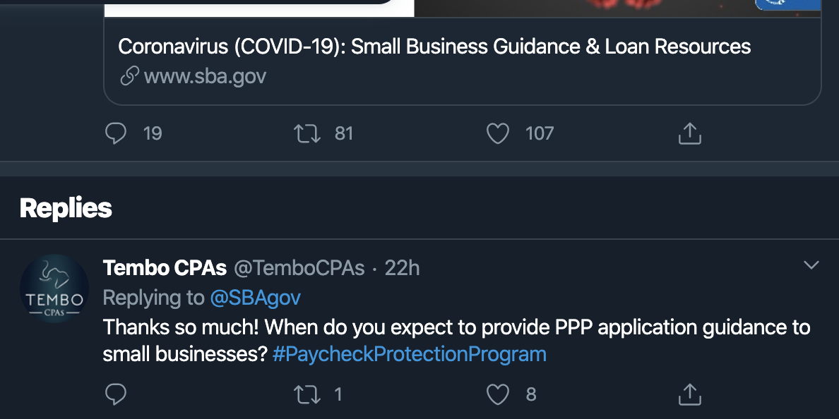 ApproachesTembo has been tweeting the SBA constantly for the past week and commenting on all their posts, in an effort to push the SBA to release some guidance on the process for applying for PPP Loans and what timing we should expect. So far, our tweets have been met with silence. I guess we need to tweet louder! If you’re on twitter, please follow @tembocpas and like and retweet our SBA tweets – maybe together we can get them to provide us with the information that all small businesses need to have.